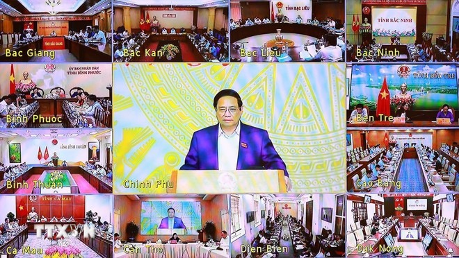 Thủ tướng Phạm Minh Chính chủ trì Phiên họp lần thứ tư của Ban Chỉ đạo xóa nhà tạm, nhà dột nát trực tuyến đến các địa phương. (Ảnh: Dương Giang/TTXVN)