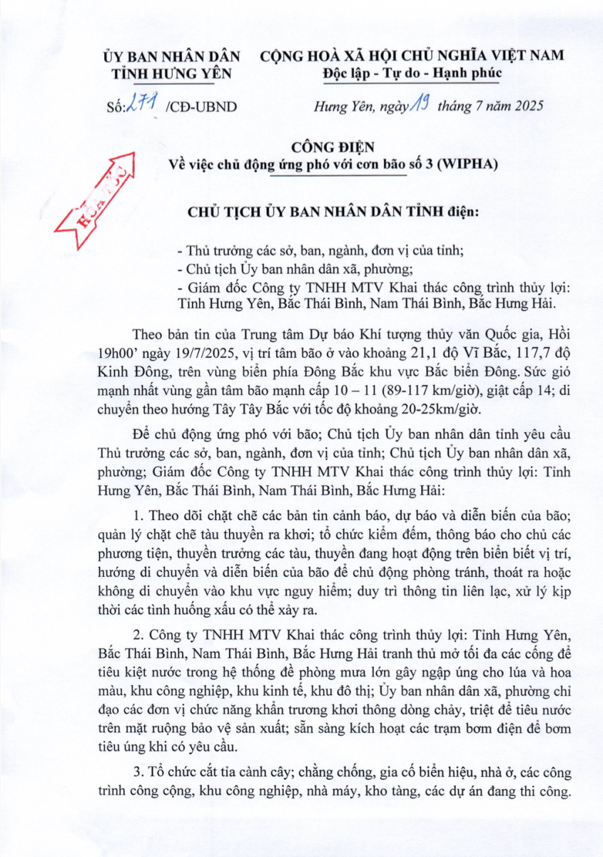 Công điện của UBND tỉnh về việc chủ động ứng phó với bão số 3