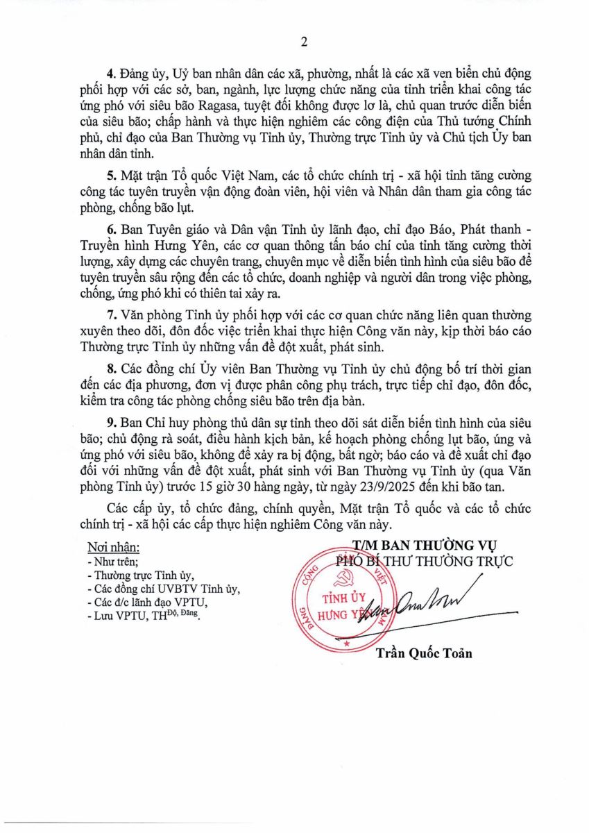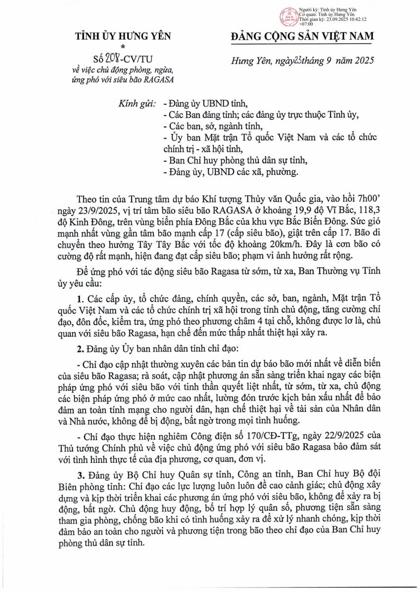 Ban Thường vụ Tỉnh ủy ban hành Công văn số 208-CV/TU ngày 23/9/2025 về chủ động phòng, ngừa, ứng phó với siêu bão RAGASA. Nêu rõ, cơn bão RAGASA là cơn bảo có cường độ rất mạnh, hiện đang đạt cấp siêu bão; phạm vi ảnh hưởng rất rộng. Đề nghị cấp ủy, tổ chức đảng, chính quyền, Mặt trận Tổ quốc và các tổ chức chính trị - xã hội các cấp thực hiện nghiêm Công văn này.