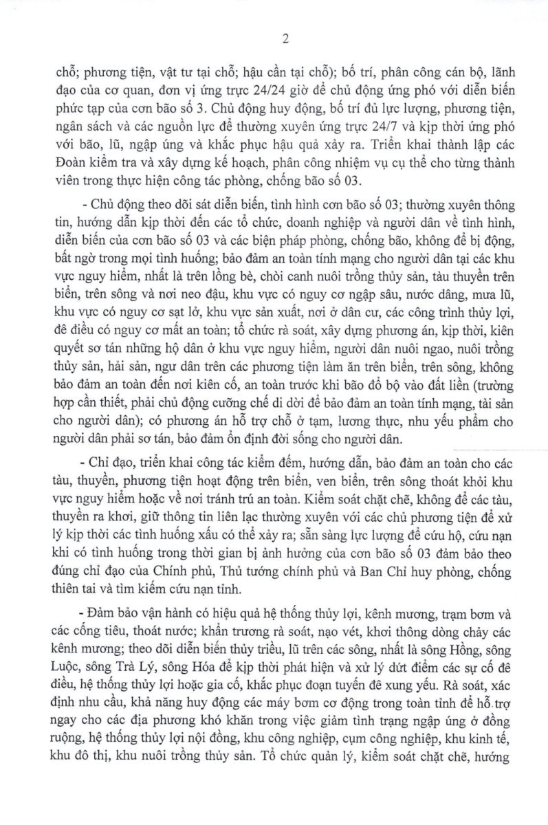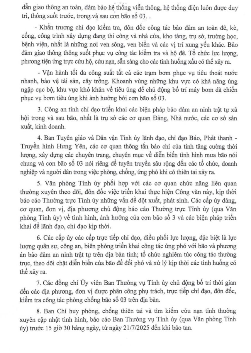 Ngày 20/7, Tỉnh ủy Hưng Yên ban hành Công văn số 48-CV/TU của Tỉnh ủy Hưng Yên về việc chủ động phòng, ngừa, ứng phó với cơn bão số 3 (WIPHA).