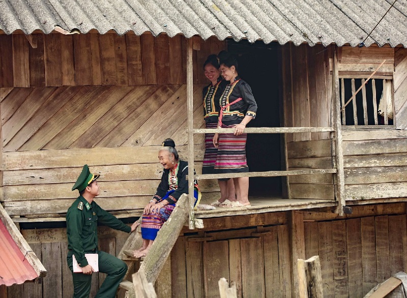 Cán bộ, chiến sĩ Đồn Biên phòng Pa Thơm (Bộ đội Biên phòng tỉnh Điện Biên) thăm hỏi đồng bào ở bản Púng Bon, xã Pa Thơm, huyện Điện Biên, tỉnh Điện Biên_Ảnh: TTXVN