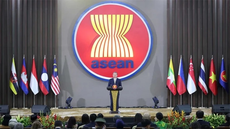 Tổng Bí thư Tô Lâm phát biểu chính sách tại lễ kỷ niệm 30 năm Việt Nam gia nhập ASEAN. (Ảnh THỐNG NHẤT/TTXVN)