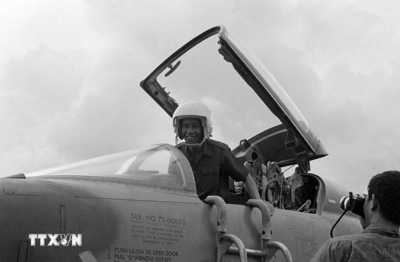 Phó Thủ tướng, Bộ trưởng Bộ Quốc phòng Lào Khamtay Siphandone lên chiếc máy bay P5 trong chuyến thăm Bộ tư lệnh Quân khu 7 và thăm sân bay Biên Hòa (1977). (Ảnh: Hứa Kiểm/TTXVN)