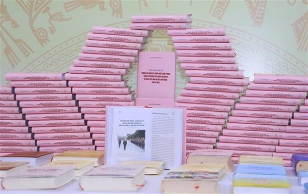 Khu trưng bày sách tại Lễ giới thiệu cuốn sách "Một số vấn đề về đường lối quân sự, chiến lược quốc phòng trong sự nghiệp xây dựng và bảo vệ Tổ quốc Việt Nam xã hội chủ nghĩa thời kỳ mới" của Tổng Bí thư Nguyễn Phú Trọng, Bí thư Quân ủy Trung ương. (Ảnh: Văn Điệp/TTXVN)