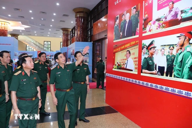 Bộ trưởng Quốc phòng Phan Văn Giang và các đại biểu tham quan khu trưng bày sách, báo, tài liệu của các đơn vị trong toàn quân. (Ảnh: Trọng Đức/TTXVN)