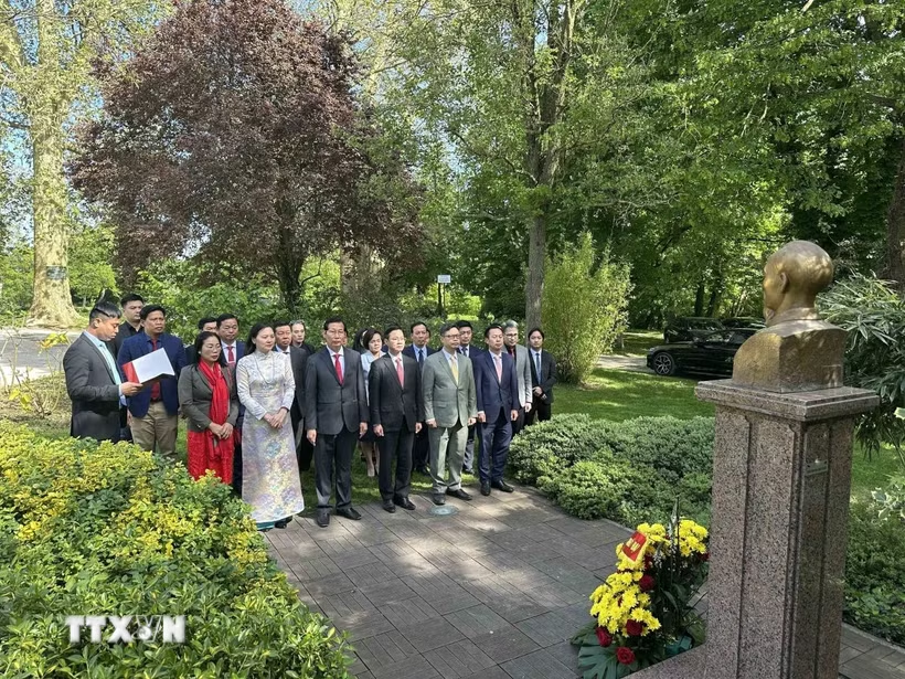 Đoàn công tác Việt Nam do Thứ trưởng Bộ Ngoại giao Ngô Lê Văn dẫn đầu tới dâng hoa tưởng niệm Chủ tịch Hồ Chí Minh tại Công viên Montreau. (Ảnh: Ngọc Hiệp/TTXVN)