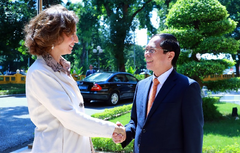 Ủy viên Trung ương Đảng, Bộ trưởng Bộ Ngoại giao Bùi Thanh Sơn đón Tổng Giám đốc UNESCO Audrey Azoulay thăm chính thức Việt Nam _Nguồn: vietnamnet.vn