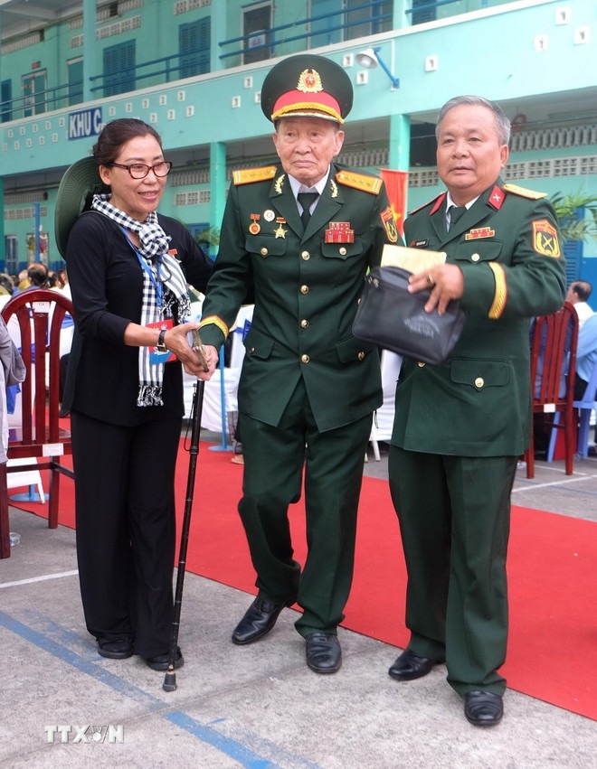 Đại tá Nguyễn Văn Tàu (bí danh Tư Cang), Anh hùng lực lượng vũ trang nhân dân tại lễ kỷ niệm. (Ảnh Hương Giang/TTXVN)