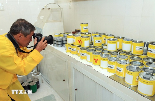 Các hộp chứa dược chất phóng xạ trước khi đóng nắp để vận chuyển đến các bệnh viện. (Ảnh: Anh Tuấn/TTXVN)