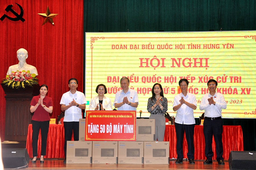 Nhân dịp này, Đại tướng Tô Lâm, Ủy viên Bộ Chính trị, Bộ trưởng Bộ Công an trao 50 bộ máy tính tặng các trường học trên địa bàn thị xã Mỹ Hào.