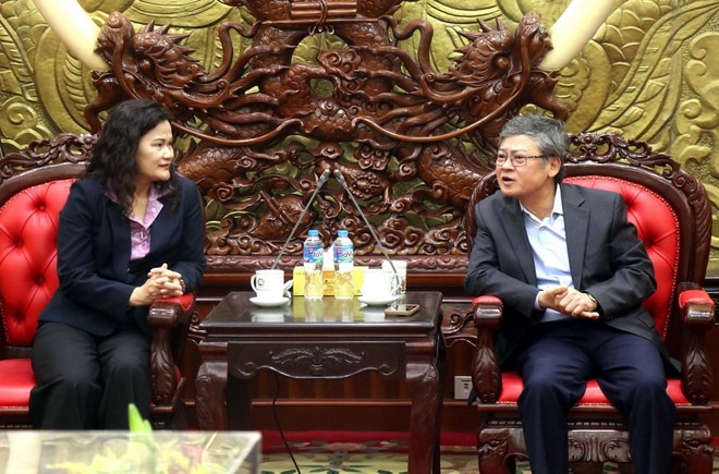 Phó Tổng Giám đốc Nguyễn Thị Sự (trái) làm việc với Phó Chủ tịch Ủy ban Nhân dân tỉnh Hưng Yên Nguyễn Duy Hưng. (Ảnh: Đinh Văn Nhiều/TTXVN)