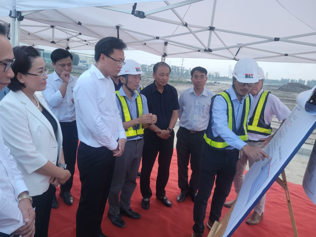 Chủ đầu tư Dự án đầu tư xây dựng và kinh doanh kết cấu hạ tầng KCN Thăng Long II mở rộng (giai đoạn 3) báo cáo tiến độ xây dựng với đồng chí Bí thư Tỉnh ủy và đoàn công tác