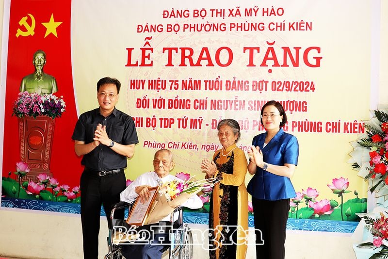 Đồng chí Bí thư Tỉnh ủy Nguyễn Hữu Nghĩa trân trọng trao Huy hiệu 80 năm tuổi Đảng tặng đảng viên Nguyễn Đức Dũng, sinh năm 1926, sinh hoạt tại Chi bộ tổ dân phố Hai Bà Trưng, Đảng bộ phường Quang Trung (thành phố Hưng Yên); trao Huy hiệu 75 năm tuổi Đảng tặng đảng viên Lê Đức Thành, sinh năm 1930, sinh hoạt tại Chi bộ tổ dân phố An Bình, Đảng bộ phường An Tảo (thành phố Hưng Yên); trao Huy hiệu 75 năm tuổi Đảng tặng đảng viên Nguyễn Sinh Thượng, sinh năm 1930, sinh hoạt tại Chi bộ 2 Tứ Mỹ, Đảng bộ phường Phùng Chí Kiên (thị xã Mỹ Hào).