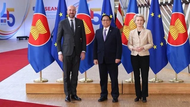 Chủ tịch Hội đồng châu Âu Charles Michel, Chủ tịch Ủy ban châu Âu Ursula Von der Leyen và Thủ tướng Phạm Minh Chính tại Hội nghị cấp cao kỷ niệm 45 năm quan hệ Hiệp hội các quốc gia Đông nam Á (ASEAN) và Liên minh châu Âu (EU), tháng 12/2022. (Ảnh: VGP/Nhật Bắc)