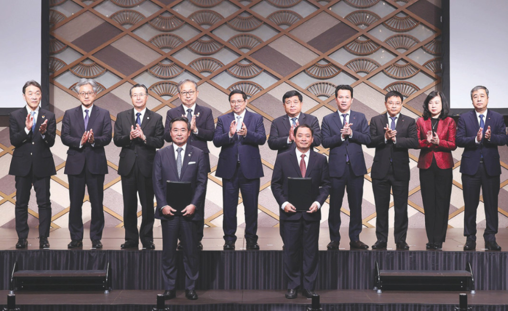 Tại Diễn đàn kinh tế Việt Nam - Nhật Bản (tháng 12/2023), trước sự chứng kiến của Thủ tướng Chính phủ Phạm Minh Chính, Chủ tịch UBND tỉnh Trần Quốc Văn và đại diện Tập đoàn Sumitomo (Nhật Bản) trao đổi bản ghi nhớ (MOU) về việc hợp tác thúc đẩy dự án Khu công nghiệp Thăng Long II, giai đoạn 4 (Ảnh: TTXVN)
