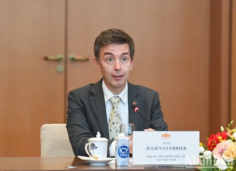 Đại sứ Julien Guerrier nhấn mạnh, EU đang triển khai mạnh mẽ các chiến lược, sáng kiến hợp tác với khu vực, nhất là Sáng kiến Cửa ngõ toàn cầu, kết nối hạ tầng, giao thông, năng lượng và hạ tầng số ở khu vực, trong đó có Việt Nam; sẵn sàng hỗ trợ Việt Nam triển khai đối tác về chuyển đổi năng lượng công bằng...