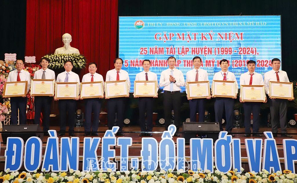 Nhân dịp này, Chủ tịch UBND tỉnh tặng bằng khen 3 tập thể, 2 cá nhân có thành tích xuất sắc trong phong trào thi đua kỷ niệm 25 năm tái lập huyện, 5 năm thành lập thị xã Mỹ Hào; tặng bằng khen cho 5 cá nhân có nhiều đóng góp vào sự phát triển KT – XH của thị xã Mỹ Hào. Chủ tịch UBND thị xã Mỹ Hào tặng giấy khen cho 13 tập thể, 20 cá nhân có thành tích xuất sắc trong phong trào thi đua kỷ niệm 25 năm tái lập huyện, 5 năm thành lập thị xã Mỹ Hào.