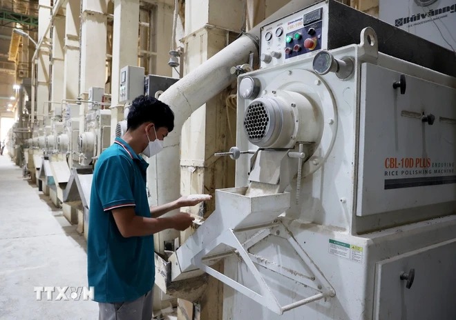 Dây chuyền làm bóng gạo xuất khẩu ở An Giang. (Ảnh: Hồng Đạt/TTXVN)