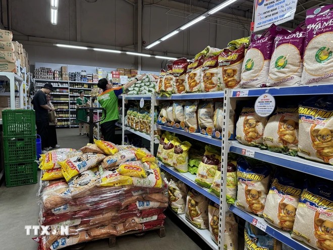 Gạo nhập khẩu được bày bán tại chuỗi siêu thị lớn Grand Lucky, Indonesia. (Ảnh: Đỗ Quyên/TTXVN)