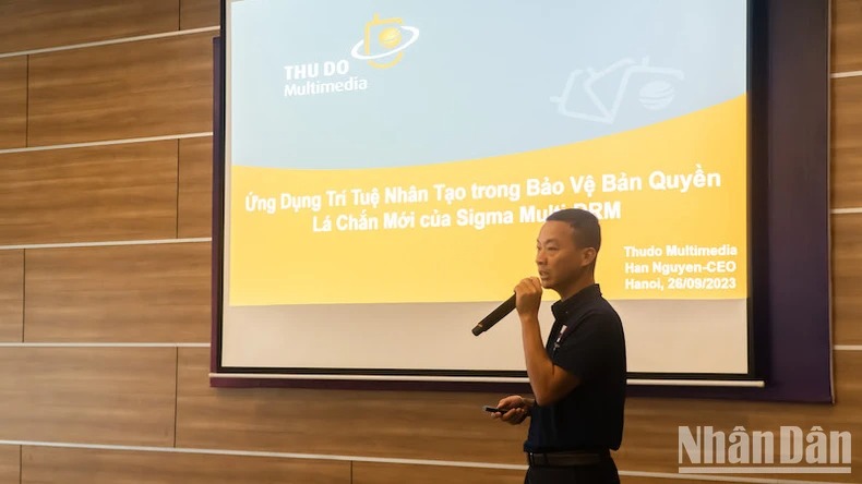 Đại diện Thủ đô Multimedia giới thiệu ứng dụng công nghệ mới trong bảo vệ bản quyền.