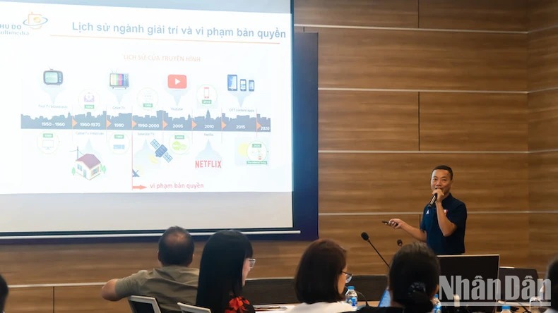 Tổng Giám đốc Công ty Thủ đô Multimedia Nguyễn Ngọc Hân trình bày về lịch sử ngành giải trí và vi phạm bản quyền.