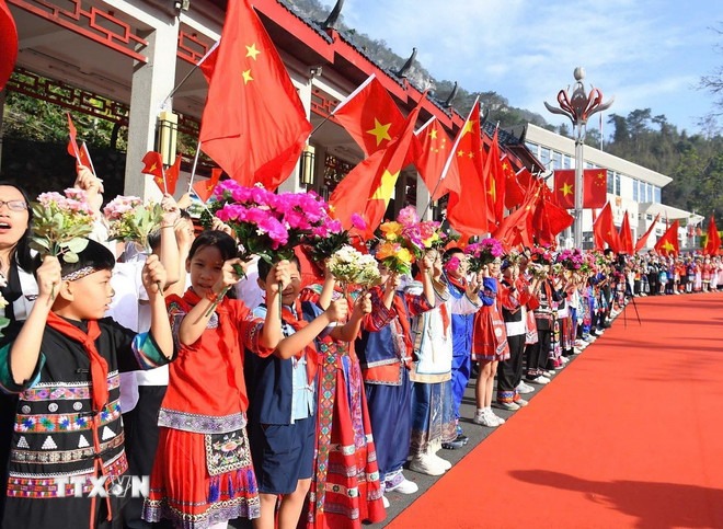 Nhân dân và học sinh Trung Quốc đón Đại tướng, Bộ trưởng Quốc phòng Phan Văn Giang và đoàn sang dự giao lưu Hữu nghị tại Cửa khẩu Quốc tế Hữu Nghị Quan (Trung Quốc). (Ảnh: TTXVN phát)