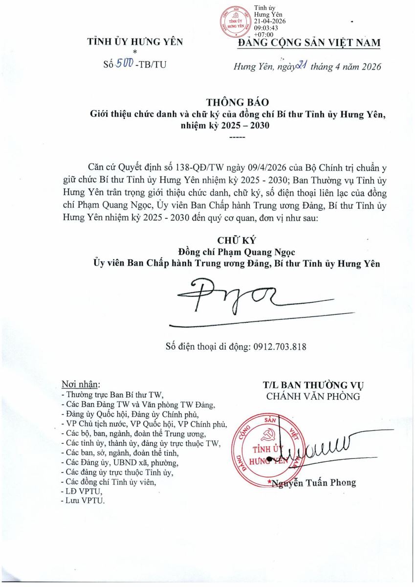 Giới thiệu chức danh và chữ ký của đồng chí Bí thư Tỉnh ủy Hưng Yên, nhiệm kỳ 2025 - 2030