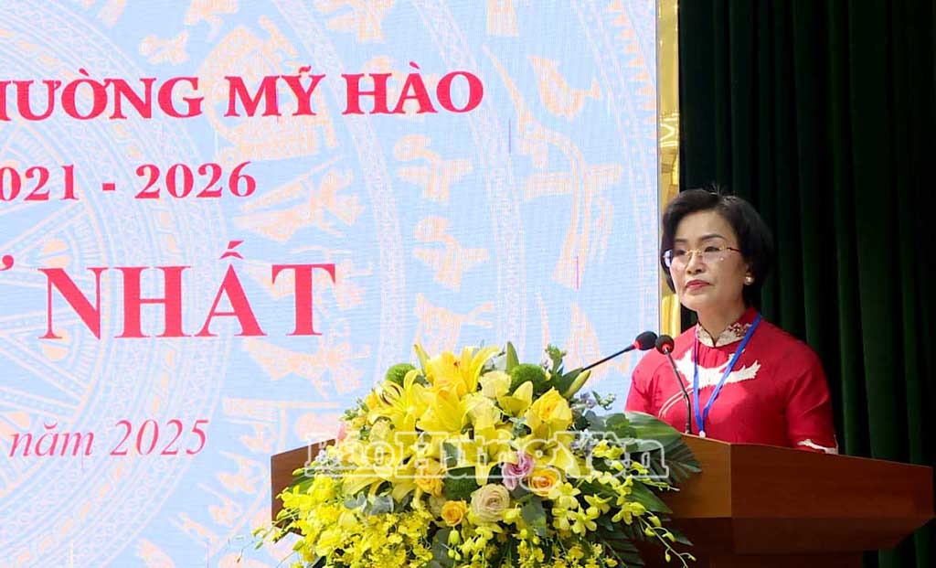 Đồng chí Trần Thị Thanh Thủy, Ủy viên Ban Thường vụ Tỉnh ủy, Bí thư Đảng ủy, Chủ tịch HĐND phường Mỹ Hào phát biểu tại kỳ họp