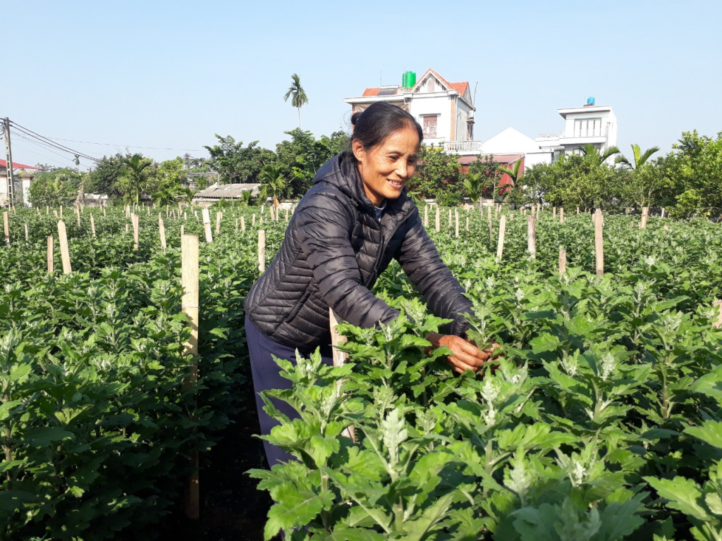 Cách đây 10 năm, gia đình bà Nguyễn Thị Loan chỉ trồng lúa và hoa màu nên thu nhập không cao. Nhận thấy hiệu quả kinh tế mà cây hoa cúc mang lại, gia đình bà đã mạnh dạn chuyển đổi sang trồng cây hoa cúc. Ban đầu, bà trồng hoa cúc vàng và cúc pha lê, những buổi đầu ít kinh nghiệm, bà gặp không ít khó khăn trong quá trình trồng và chăm sóc cây nên hiệu quả chưa cao. Sau khi được Hội Nông dân xã giới thiệu về kyx thuật trồng, chăm sóc hoa cúc, mô hình trồng hoa cúc trong nhà lưới… đã giúp bà có thêm nhiều kiến thức, kinh nghiệm. Những năm gần đây, bà chuyển hẳn sang trồng cây cúc tàu bởi hoa to, đẹp, lâu tàn, được thị trường ưa chuộng. Với giá bán trung bình 3 - 4 nghìn đồng mỗi bông, trừ chi phí mỗi năm gia đình bà thu lãi khoảng 300 – 400 triệu đồng. Nhờ trồng hoa cúc đã mang lại cho gia đình bà nguồn thu nhập đáng kể, xây dựng được nhà cửa khang trang, đời sống được nâng lên. Hiện nay, gia đình bà đã mở rộng diện tích trồng hoa cúc lên hơn 1 mẫu. Bà Loan chia sẻ: Trồng hoa cúc không khó nhưng để hoa to, đẹp đáp ứng nhu cầu của thị trường thì ngoài yếu tố cây giống, người trồng phải kiên trì, tỉ mỉ tuân thủ yêu cầu kỹ thuật thì cây sẽ nở đúng dịp và cho giá trị cao. Khi cây bị sâu bệnh cần có biện pháp xử lý kịp thời. Cây hoa cúc cần tưới nước thường xuyên nhưng chỉ cần một lượng vừa phải. Để cây ra hoa vào đúng dịp tết cần áp dụng một số biện pháp khoa học kỹ thuật như điều chỉnh lượng phân bón sao cho phù hợp, điều chỉnh độ ấm, độ ánh sáng của cây. Trong quá trình trồng, các luống cần phải có khung giấy bóng che mưa nắng, tránh côn trùng làm ảnh hưởng đến chất lượng hoa.