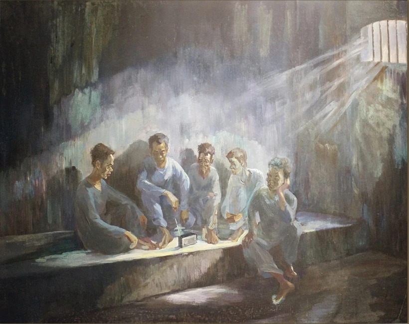 Tranh vẽ tù nhân Côn Đảo nghe radio trong phòng giam. Nguồn: Trung tâm Bảo tồn Di tích quốc gia Côn Đảo