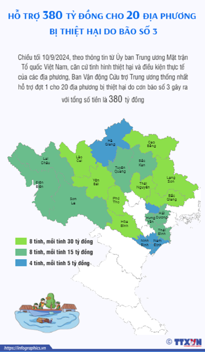 Chiều tối 10/9, theo thông tin từ Ủy ban Trung ương Mặt trận Tổ quốc Việt Nam, căn cứ tình hình thiệt hại và điều kiện thực tế của các địa phương, Ban Vận động Cứu trợ Trung ương thống nhất hỗ trợ đợt 1 cho 20 địa phương bị thiệt hại do cơn bão số 3 gây ra với tổng số tiền là 380 tỷ đồng