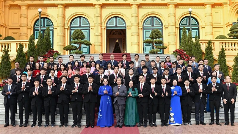 Phó Chủ tịch nước Võ Thị Ánh Xuân, Bộ trưởng Giáo dục và Đào tạo Nguyễn Kim Sơn cùng các đại biểu và các em học sinh đoạt giải Olympic và Khoa học kỹ thuật quốc tế năm 2024. (Ảnh TRẦN HIỆP)