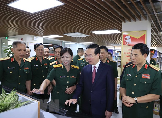 Chủ tịch nước Võ Văn Thưởng nghe giới thiệu về thư viện của Học viện Quốc phòng. (Ảnh: Thống Nhất/TTXVN)