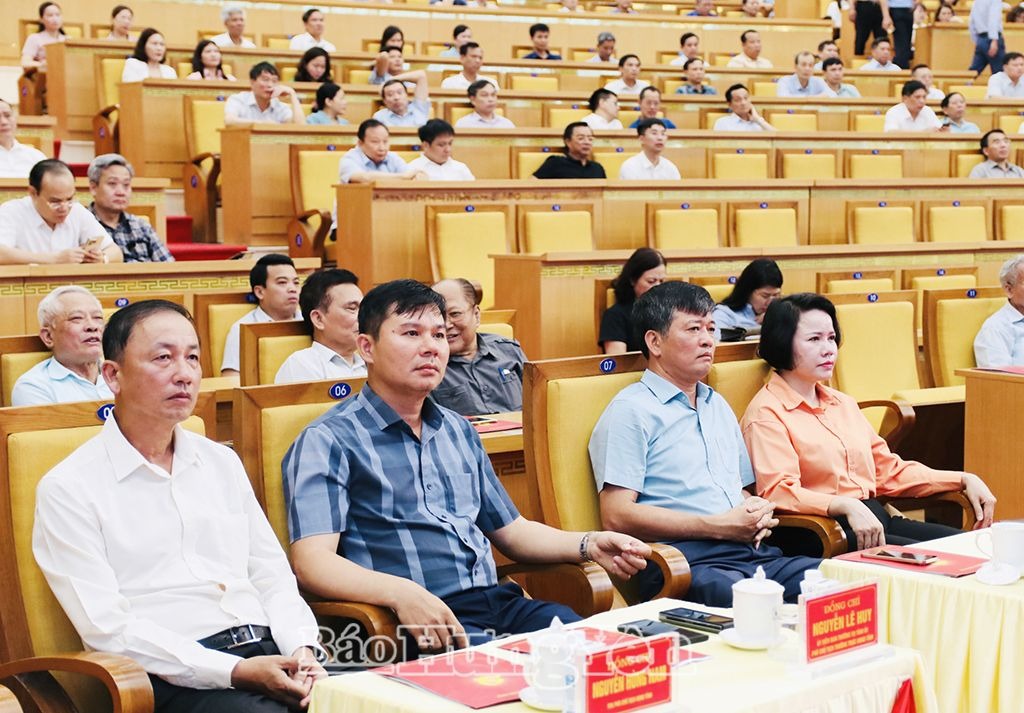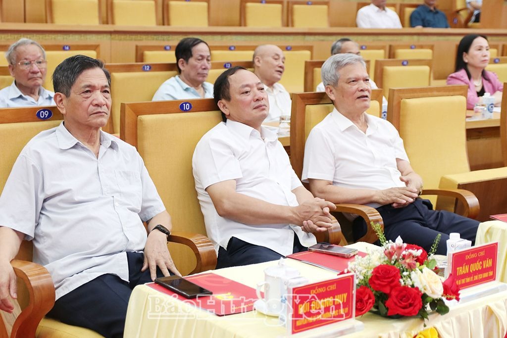 Đồng chí Nguyễn Hữu Nghĩa, Ủy viên BCH Trung ương Đảng, Bí thư Tỉnh ủy (bên trái), đồng chí Trần Quốc Toản, Phó Bí thư Thường trực Tỉnh ủy, Chủ tịch HĐND tỉnh (ngồi giữa), cùng các đồng chí nguyên lãnh đạo tỉnh dự hội nghị
