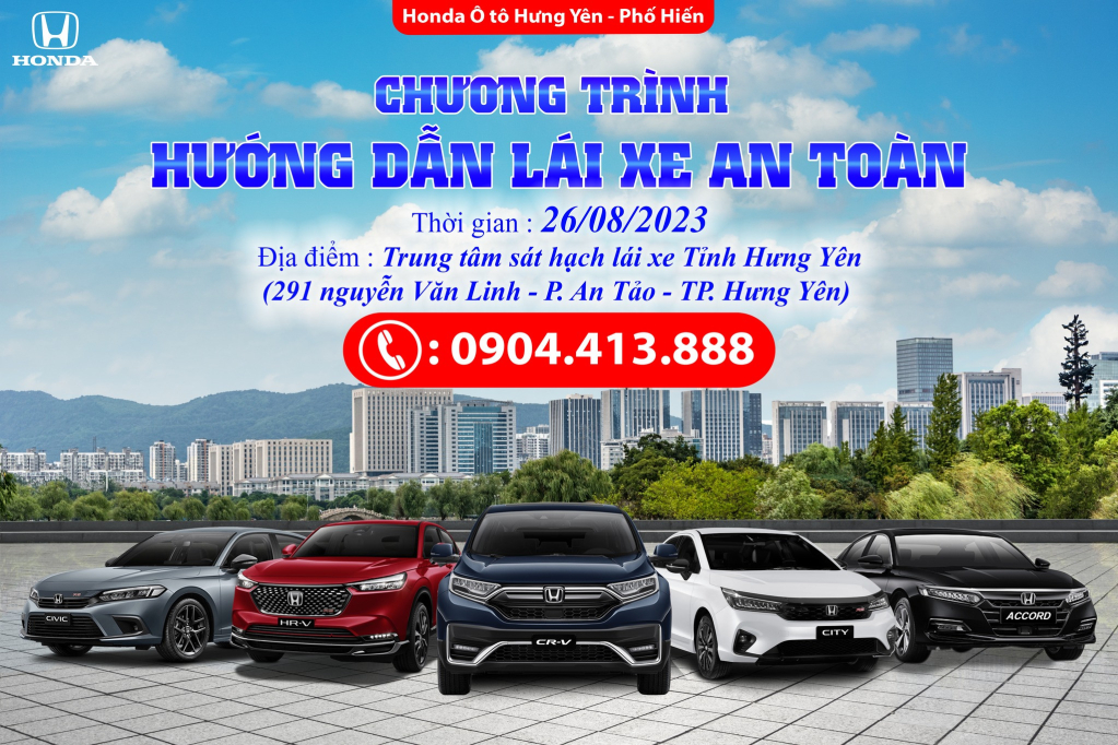 Ngày 26/8 tới đây, Honda Ôtô Hưng Yên – Phố Hiến (Đại lý Ôtô Honda 5S chính hãng tại Hưng Yên) sẽ tổ chức chương trình “Hướng dẫn lái xe an toàn” tại Trung tâm sát hạch lái xe tỉnh (Số 291 đường Nguyễn Văn Linh, phường An Tảo, thành phố Hưng Yên).