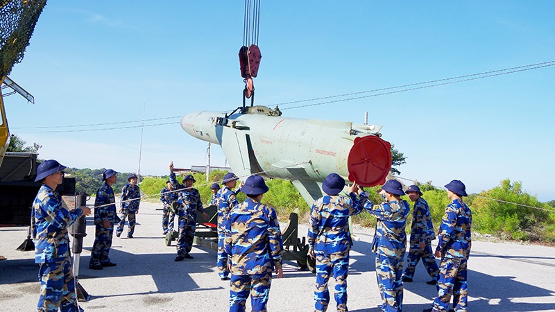 Bộ đội Lữ đoàn 679, Vùng 1 Hải quân cẩu tên lửa chuẩn bị diễn tập.