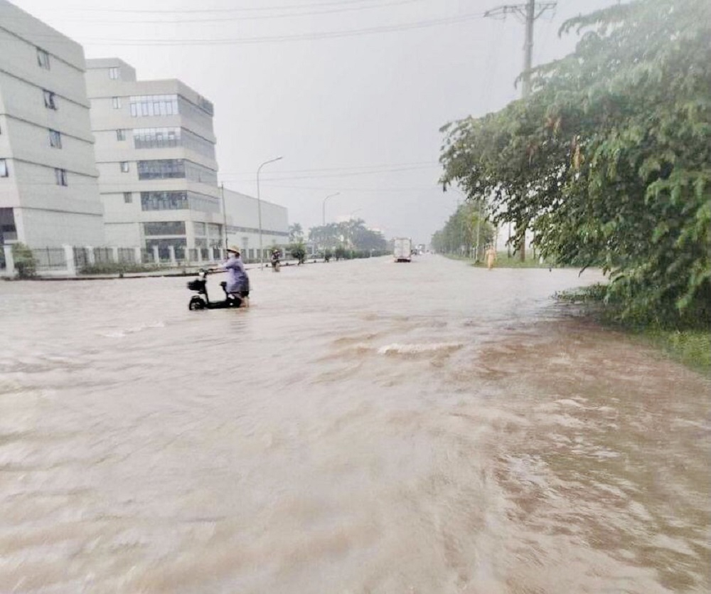 Một tuyến đường thuộc Khu công nghiệp Phố Nối A ngập sâu sau trận mưa lớn sáng ngày 28/9
