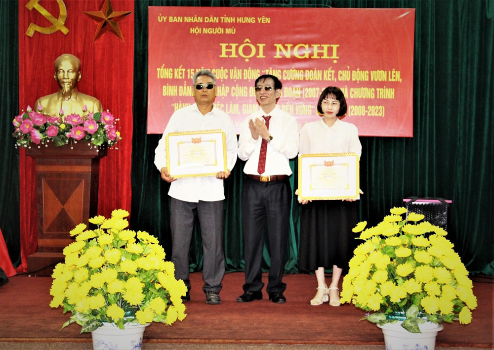 Nhân dịp này, Trung ương Hội Người mù Việt Nam tặng Bằng khen 2 cá nhân; Hội Người mù tỉnh tặng giấy khen 7 cá nhân có thành tích trong thực hiện cuộc vận động “Tăng cường đoàn kết, chủ động vươn lên, bình đẳng, hòa nhập cộng đồng” giai đoạn 2007 - 2022 và Chương trình “Hành động việc làm, giảm nghèo bền vững” giai đoạn 2008 - 2023.