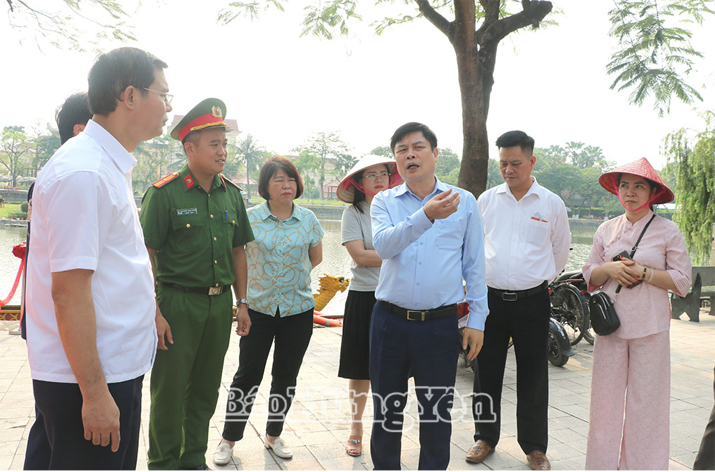 Đồng chí Phó Chủ tịch UBND tỉnh Phạm Văn Nghiêm kiểm tra công tác tổ chức lễ thả đèn hoa đăng tại khu vực Hồ Bán Nguyệt.