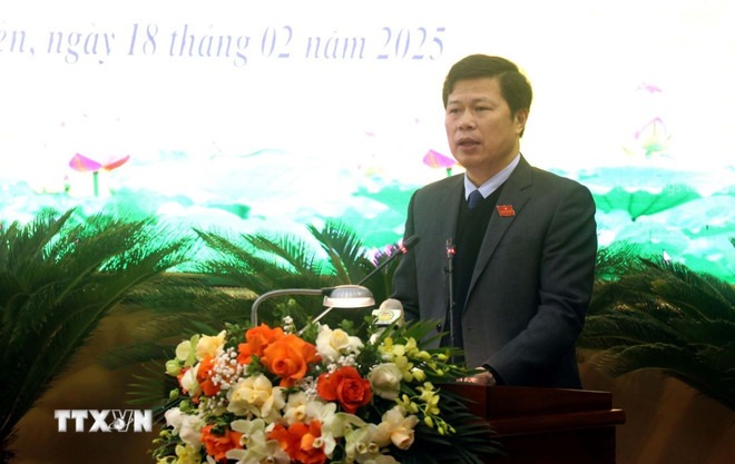 Phó Bí thư Thường trực Tỉnh ủy, Chủ tịch Hội đồng Nhân dân tỉnh Hưng Yên Trần Quốc Toản phát biểu tại Kỳ họp. (Ảnh: Đinh Văn Nhiều/TTXVN)