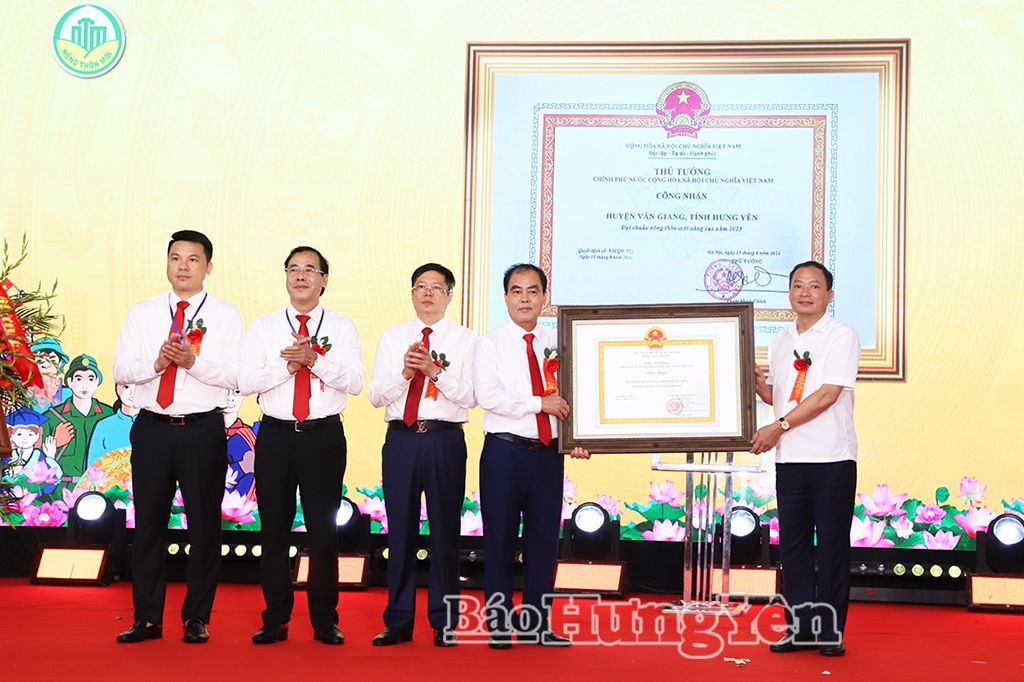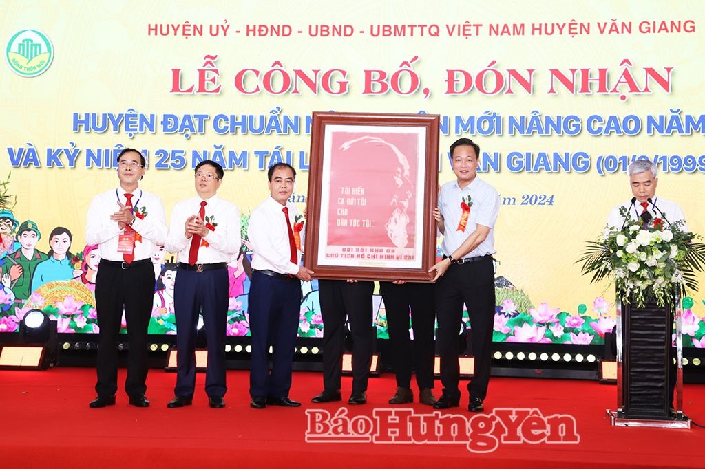 Tại buổi lễ, thừa ủy quyền của Thủ tướng Chính phủ, đồng chí Chủ tịch UBND tỉnh Trần Quốc Văn trao Bằng công nhận huyện đạt chuẩn NTM nâng cao năm 2023 tặng Đảng bộ, chính quyền và Nhân dân huyện Văn Giang; tặng Bằng khen của Chủ tịch UBND tỉnh cho 6 tập thể, 1 hộ gia đình và 10 cá nhân trên địa bàn huyện có thành tích xuất sắc trong phong trào thi đua “Cả nước chung sức xây dựng NTM giai đoạn 2021 – 2025”; tặng Bằng khen của Chủ tịch UBND tỉnh cho 3 tập thể và 2 cá nhân có thành tích xuất sắc trong phong trào thi đua chào mừng kỷ niệm 25 năm tái lập huyện Văn Giang (1/9/1999 – 1/9/2024).