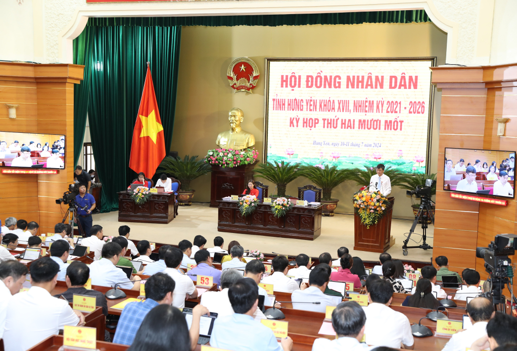 Thay mặt UBND tỉnh, đồng chí Nguyễn Lê Huy, Ủy viên Ban Thường vụ Tỉnh ủy, Phó Chủ tịch Thường trực UBND tỉnh báo cáo tình hình thực hiện kế hoạch phát triển kinh tế - xã hội; thu chi ngân sách nhà nước; kế hoạch vốn đầu tư công 6 tháng đầu năm và nhiệm vụ, giải pháp chủ yếu 6 tháng cuối năm 2024. Theo báo cáo, trong 6 tháng đầu năm, tình hình kinh tế - xã hội của tỉnh đạt được kết quả tích cực. Tăng trưởng kinh tế duy trì ở mức khá, ngành xây dựng tiếp tục phát triển, ngành công nghiệp nỗ lực vượt qua khó khăn, nông nghiệp phát triển ổn định. Tổng thu ngân sách vượt tiến độ đề ra. Tổng sản phẩm trên địa bàn tỉnh (GRDP) tăng 6,81%, xếp thứ 8/11 tỉnh, thành phố thuộc khu vực đồng bằng sông Hồng. Tổng vốn đầu tư phát triển toàn xã hội là 31.877,8 tỷ đồng, đạt 45,5% kế hoạch. Tổng thu ngân sách đến hết ngày 30/6/2024 là 22.066 tỷ đồng, đạt 67,2% dự toán HĐND tỉnh giao, trong đó thu nội địa 19.898 tỷ đồng. Tỷ lệ trường học các cấp đạt chuẩn quốc gia là 81,56%; tỷ lệ phòng học kiên cố đạt 95,85%; tạo việc làm mới cho 12.590 người; tỷ lệ người dân tham gia bảo hiểm y tế đạt 93,5%; tỷ lệ lao động trong độ tuổi tham gia bảo hiểm xã hội đạt 44. Dự kiến đợt 1 năm 2024 đề nghị công nhận thêm 2 huyện Văn Giang và Phù Cừ đạt chuẩn nông thôn mới nâng cao, 26 xã đạt chuẩn nông thôn mới nâng cao, 8 xã đạt chuẩn nông thôn mới kiểu mẫu. Về môi trường, đô thị, tỷ lệ chất thải nguy hại được thu gom, xử lý ước đạt 100%; tỷ lệ chất thải rắn sinh hoạt đô thị được thu gom, xử lý ước đạt 90%; tỷ lệ khu công nghiệp đang hoạt động có hệ thống xử lý nước thải tập trung đạt tiêu chuẩn môi trường ước đạt 100%; tỷ lệ đô thị hóa ước đạt 45%...