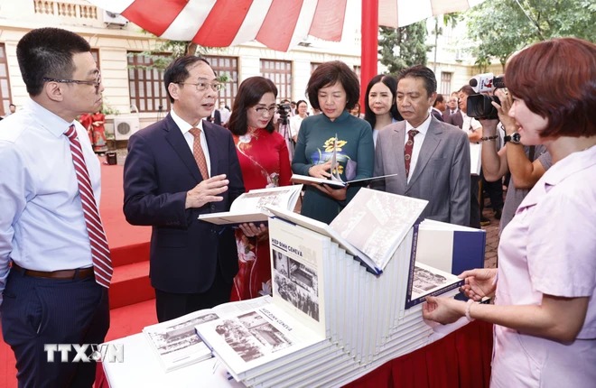 Bộ trưởng Bộ Ngoại giao Bùi Thanh Sơn và đại biểu xem sách ảnh “Hiệp định Geneva 1954 - Dấu mốc lịch sử trong sự nghiệp cách mạng Việt Nam.” (Ảnh: Doãn Tấn/TTXVN)