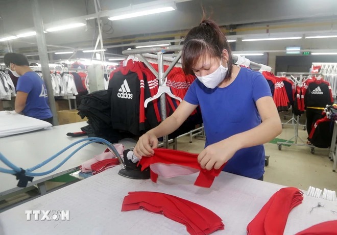 May hàng xuất khẩu tại Nhà máy May TNG Đại Từ, tỉnh Thái Nguyên thuộc Công ty cổ phần Đầu tư và Thương mại TNG. (Ảnh: Trần Việt/TTXVN)