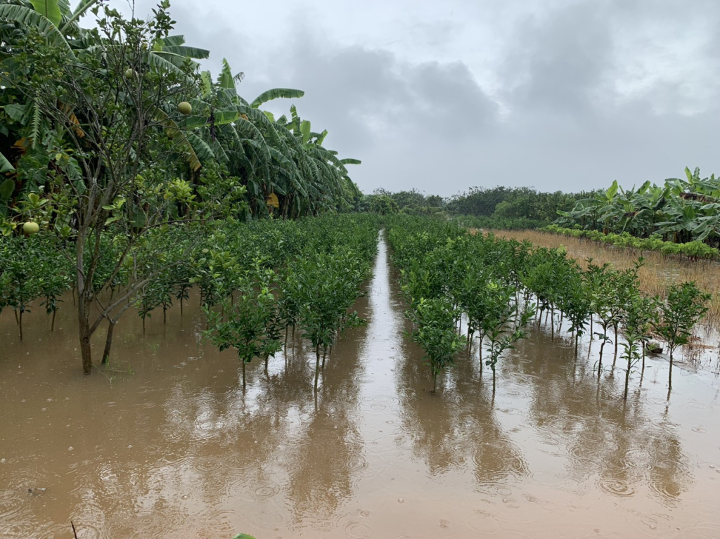 Những vườn chuyên canh trồng nhãn ở xã Hồng Nam (thành phố Hưng Yên) bị ngập nặng