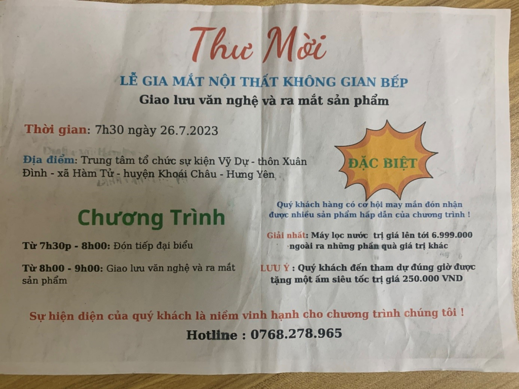 Theo phản ánh của người dân thôn Xuân Đình, xã Hàm Tử, vào ngày 25/7, trên địa bàn thôn xuất hiện một nhóm người tự xưng là nhân viên đại diện cho 40 doanh nghiệp tổ chức lễ ra mắt nội thất không gian bếp mang thư đến nhiều nhà mời dự giao lưu văn nghệ và ra mắt sản phẩm tại Trung tâm tổ chức sự kiện Vỹ Dự thuộc thôn Xuân Đình. Theo lời giới thiệu của nhóm nhân viên này, chương trình diễn ra trong 3 ngày (từ ngày 26 đến ngày 28/7) với tổng trị giá 800 triệu đồng, trong đó 200 triệu đồng chi phí tổ chức chương trình, còn lại là sản phẩm dành để tặng cho khách hàng trị giá 600 triệu đồng. Trong thư mời, khách hàng đến dự đúng giờ được tặng 1 ấm siêu tốc trị giá 250 nghìn đồng. Trong buổi sáng ngày 26/7, chương trình có khoảng 120 người đến dự. Vào đầu buổi sáng, nhóm người này giới thiệu nội dung, chương trình, các sản phẩm mới... Đến trưa, những người đến dự đều được tặng quà gồm: 1 ấm đun nước siêu tốc, 1 chai nước mắm, 10 chiếc thìa inox, 1 đèn Led tích điện. Điều này làm người dân phấn khởi, hào hứng nhận lời tiếp tục dự chương trình vào các buổi sau. Sau khi mời khách ăn trưa, trước khi về nhà, nhóm nhân viên thông báo chương trình tiếp tục diễn ra và buổi chiều, nếu ai mời thêm được 3 người thì sẽ được tặng 1kg bột nêm. Vì vậy, buổi chiều số người dự tăng lên khoảng 350 người, đến từ các xã: Hàm Tử, Tứ Dân, Dạ Trạch, Tân Dân.