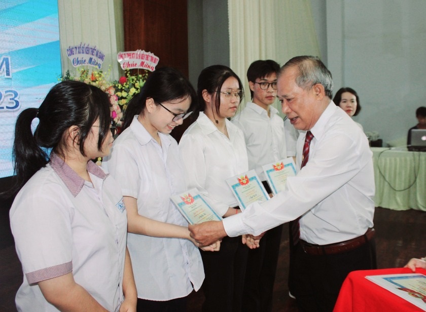 Chủ tịch Hội Khuyến học tỉnh Bà Rịa - Vũng Tàu Lương Đức Đích trao học bổng tặng các học sinh, sinh viên. (Ảnh: Khánh Chi)