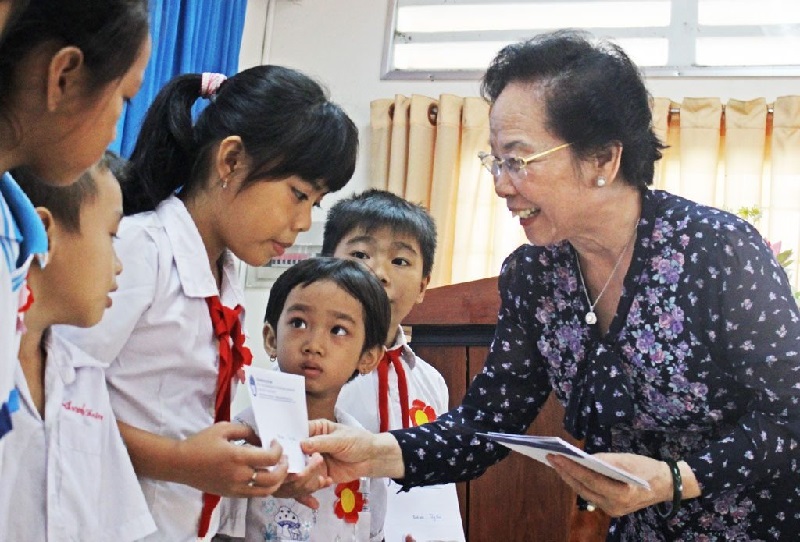 Nguyên Phó Chủ tịch nước, Chủ tịch Hội Khuyến học Việt Nam – Giáo sư, Tiến sĩ Nguyễn Thị Doan trao học bổng cho các em học sinh. (Ảnh Báo Long An).