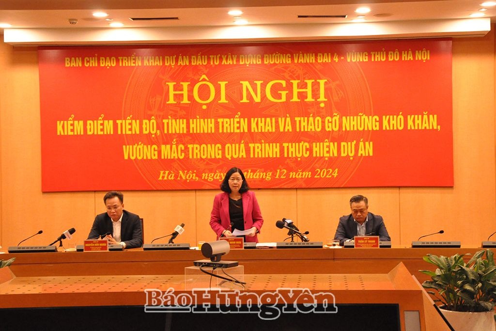 Phát biểu kết luận hội nghị, đồng chí Bùi Thị Minh Hoài, Ủy viên Bộ Chính trị, Bí thư Thành ủy Hà Nội, Trưởng Ban chỉ đạo ghi nhận sự nỗ lực, linh hoạt của các địa phương, sự vào cuộc tháo gỡ khó khăn, vướng mắc, hỗ trợ, hướng dẫn của các bộ, ngành trong việc triển khai thực hiện dự án. Tuy nhiên, quá trình triển khai vẫn còn tồn tại những khó khăn, vướng mắc ảnh hưởng tới tiến độ Dự án. Đồng chí Bí thư Thành ủy Hà Nội Bùi Thị Minh Hoài nhấn mạnh: Dự án đầu tư xây dựng đường Vành đai 4 – Vùng Thủ đô Hà Nội là dự án trọng điểm quốc gia, có ý nghĩa quan trọng để liên kết vùng, thúc đẩy phát triển kinh tế - xã hội. Vì vậy, các địa phương tập trung khắc phục khó khăn, vướng mắc để bảo đảm tiến độ thực hiện dự án theo chỉ đạo của Quốc hội, Chính phủ và Thủ tướng Chính phủ. Đối với những đề xuất, kiến nghị của các địa phương, Ban Chỉ đạo sẽ tổng hợp báo cáo, đề xuất với Quốc hội, Chính phủ và các bộ, ngành tháo gỡ trong thời gian sớm nhất. Trong thời gian tới, các địa phương cần huy động sức mạnh tổng hợp của cả hệ thống chính trị để triển khai đồng thời các nhiệm vụ để rút ngắn thời gian thực hiện các công việc, trong đó, đặc biệt là tháo gỡ khó khăn, vướng mắc, đẩy nhanh tiến độ giải phóng mặt bằng…