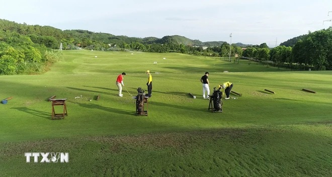 Du khách chơi golf kết hợp tham quan trải nghiệm tại sân golf Tràng An, huyện Nho Quan, tỉnh Ninh Bình. (Ảnh: Thùy Dung/TTXVN)